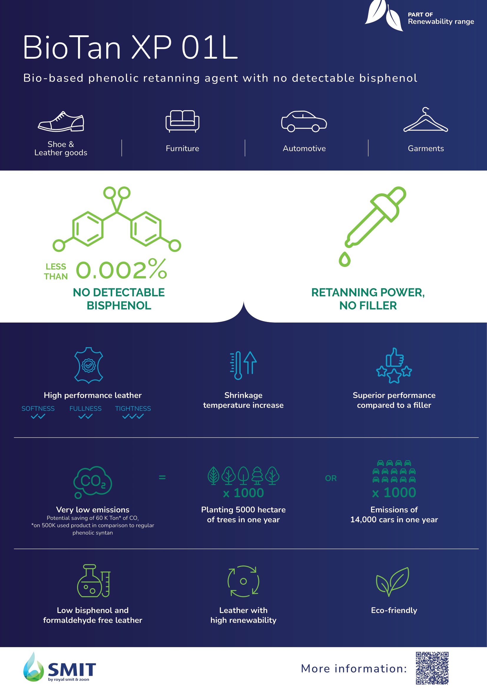 Bisphenols have become an important topic of discussion in the leather industry, especially since the restriction proposal of the European Chemicals Agency on bisphenols. To meet regulations and to hold on to our mission statement, to create a sustainable leather value chain, our subisidairy Smit has developed a special range of wet end solutions optimized on bisphenols for high quality leather. We offer syntans with low bisphenol values and introduce BioTan XP 01L, an innovative retanning agent with no detectable bisphenol. All our bisphenol optimized solutions are thoroughly tested, both on performance and on bisphenol limits. Download brochure The future of retanning is now, with BioTan XP 01L. Imagine retanning of the future; low emissions, bio-based ingredients and free of bisphenol and formaldehyde. With the power of a traditional phenolic retanning agent and no compromise on the performance, fullness and softness of the leather BioTan XP 01L offers just that. No detectable bisphenol. With tanning power. BioTan XP 01L is the latest innovation of Smit wet end and part of their recently launched Renewability range. An innovative phenolic retanning agent that is partly bio-based. It’s not a blend and not a filler. It is your next step in meeting the demand for low emissions and to build further towards a sustainable way of leather making. No detectable bisphenol values Multiple independent test results confirm this: bisphenol-F and bisphenol-S values are always below detection limit in BioTan XP 01L. On leather, so on Zeo White or wet blue retanned with BioTan XP 01L, analyses also show bisphenol values below detection limits on BPS, BPF, BPA, BPB. The main benefits of BioTan XP 01L: Tanning power, no filler Bio-based polymer produced by patented technology No detectable bisphenol Free of formaldehyde Very low emission values BioTan XP 01L gives you sustainable future-proof retanning without compromises on leather performance. Like no other retanning agent does. More information? Request the TDS Phenol-based, low bisphenol retanning solutions Download our brochure with bisphenol low retanning solutions Download pdf here Interesting for you Discover more news Smit expands range of sustainable Wet-end chemicals The launch of these products contributes to Royal Smit & Zoon’s mission, to create a more sustainable leather value chain, by using more bio-based products and lower emission rates. APLF Dubai: ILM Conference ‘Future Trends in a Post-COVID Leather Industry’ On March 29, Royal Smit & Zoon will host a conversation about 'Enabling positive change in the leather industry' during the half-day hybrid conference ‘Future trends in a post-Covid leather industry’ at APLF Dubai, co-organised by International Leather Maker and APLF. Royal Smit & Zoon presents 2023 ESG Report The annual ESG report highlights Royal Smit & Zoon’s progress, solutions and ambitions dedicated to its mission, to create a socially and environmentally sustainable leather value chain, together. More news Go to all news articles Discover Stay informed Receive the latest company news and industry updates Subscribe to our newsletter Share this: